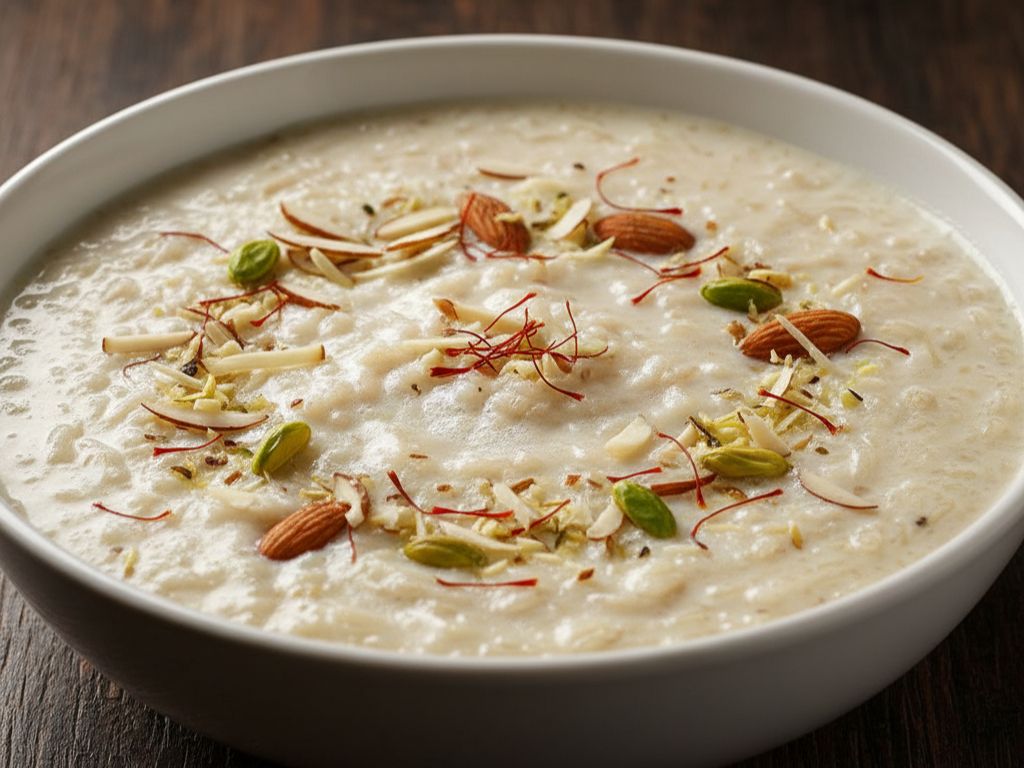 A creamy Indian rice pudding delicately flavored with cardamom, garnished with nuts and raisins.