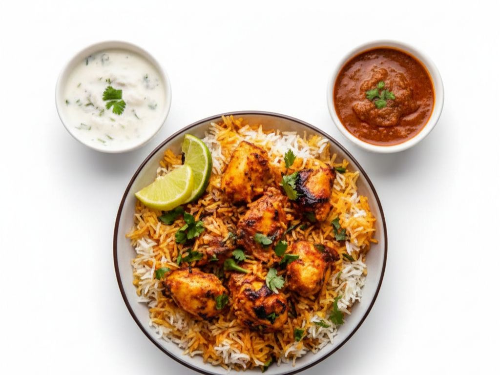 Hyderabad dum-style layered, saffron-flavored basmati rice cooked with chicken leg & thigh marinated in nizami spices, served with salan and raita.