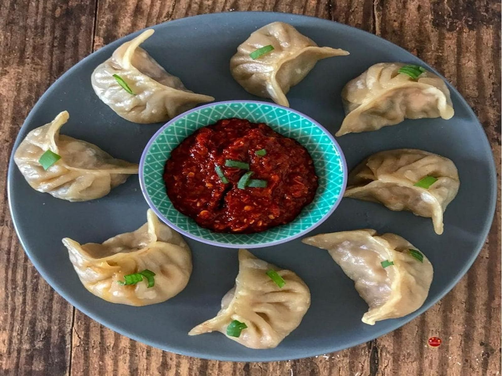 Steamed dumplings with seasoned ground chicken served with tomato-cilantro sauce.
