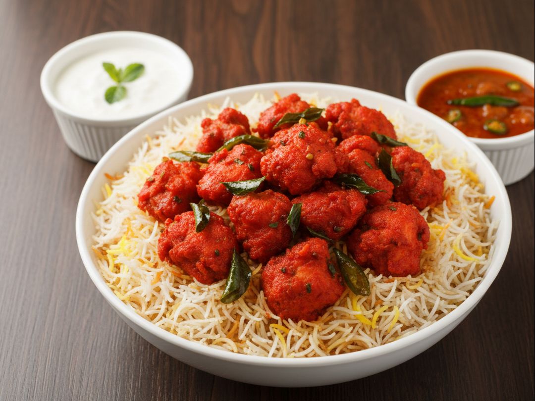 A fusion of crispy cauliflower 65 and flavorful biryani rice, perfect for a vegetarian twist on a classic.