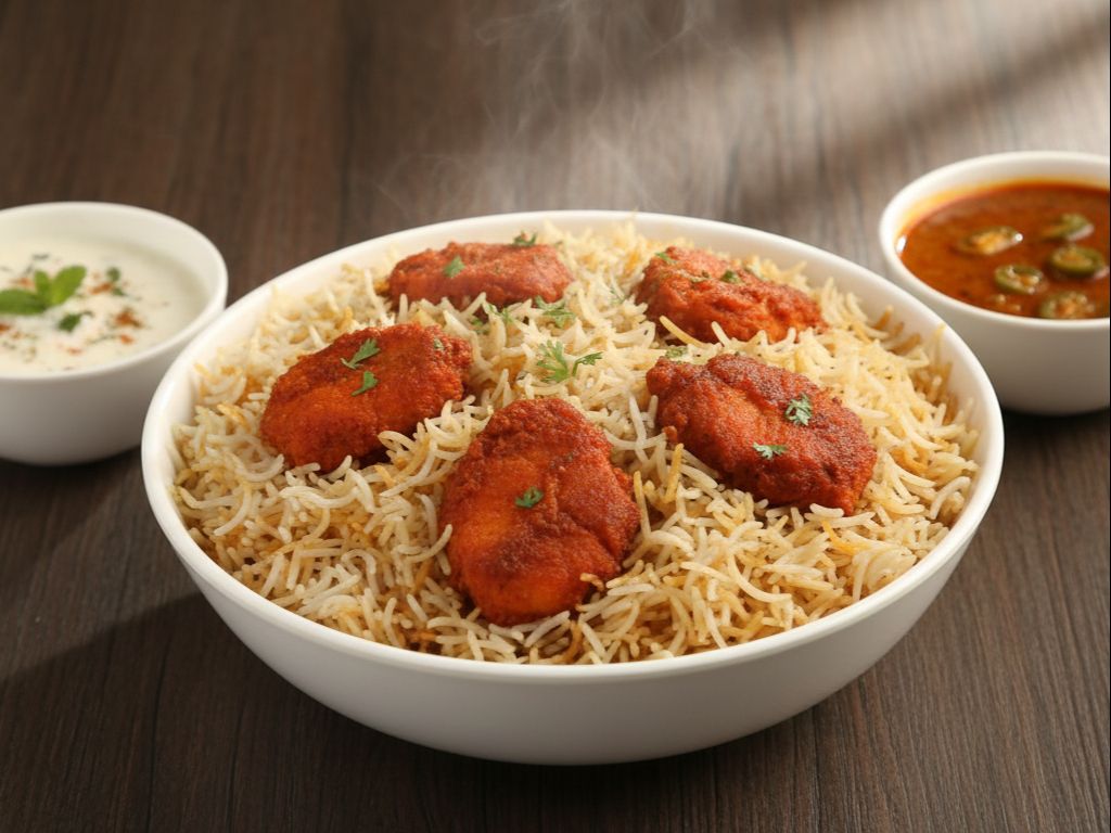 A delightful blend of crispy, spiced fish 65 and fragrant biryani rice, layered with traditional spices for a flavorful experience.