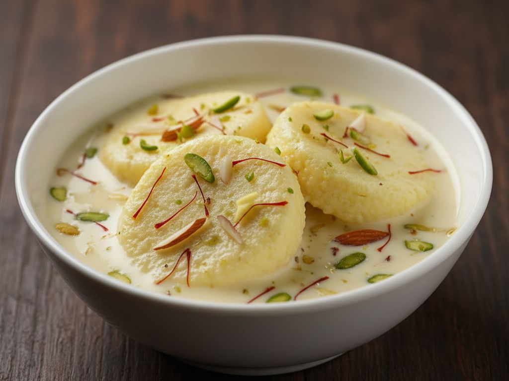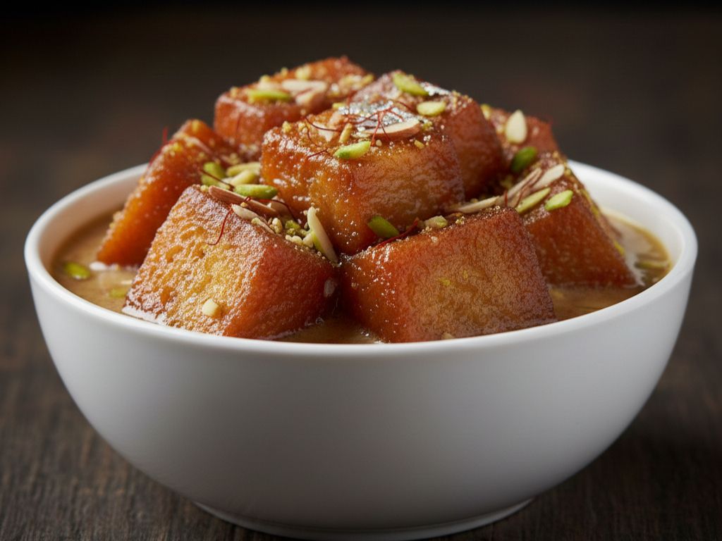 A traditional hyderabadi dessert made with fried bread slices soaked in rich milk syrup, flavored with cardamom and saffron.