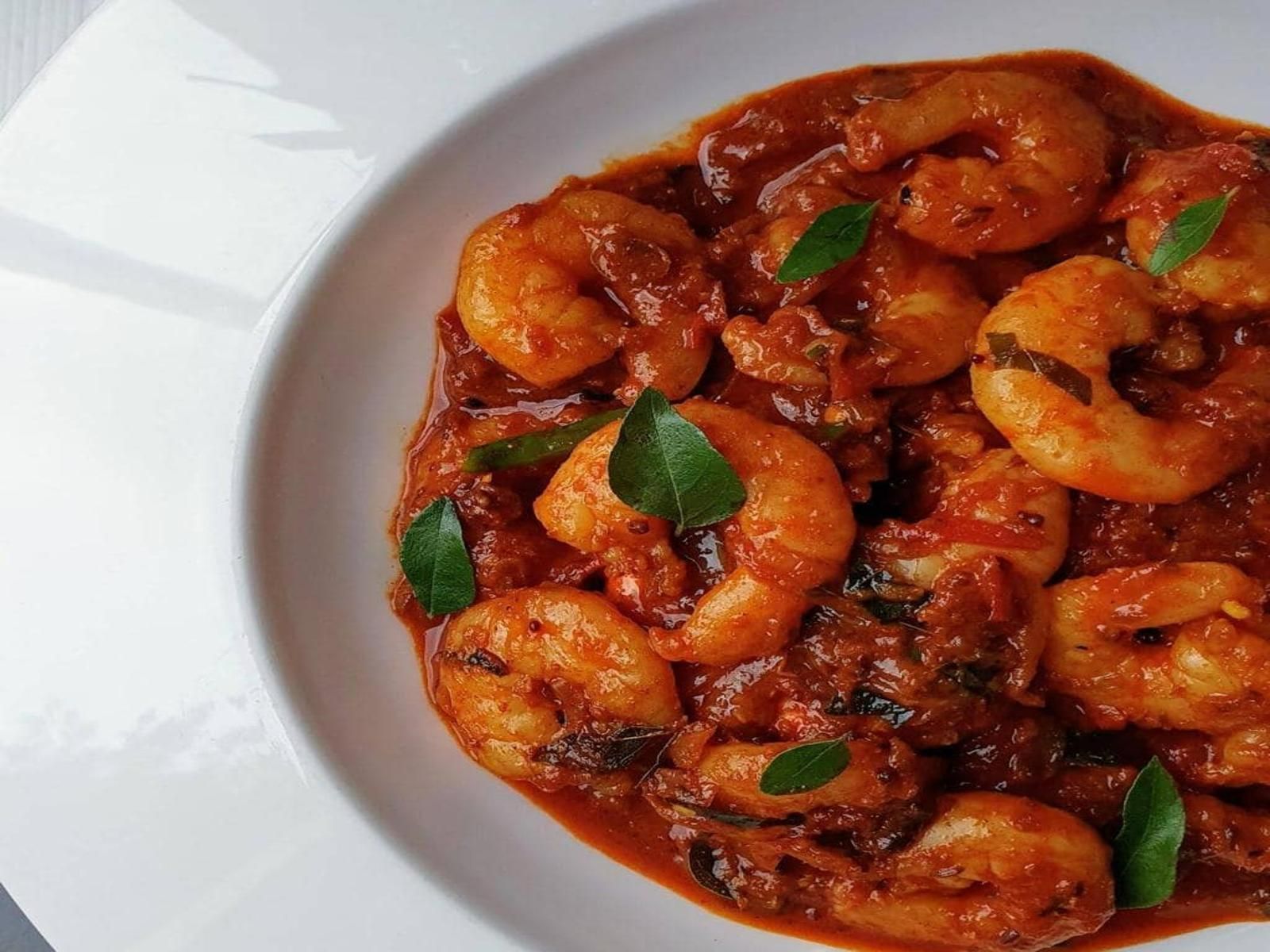 A spicy and tangy goan curry featuring shrimp cooked with vinegar, potatoes, and aromatic spices.