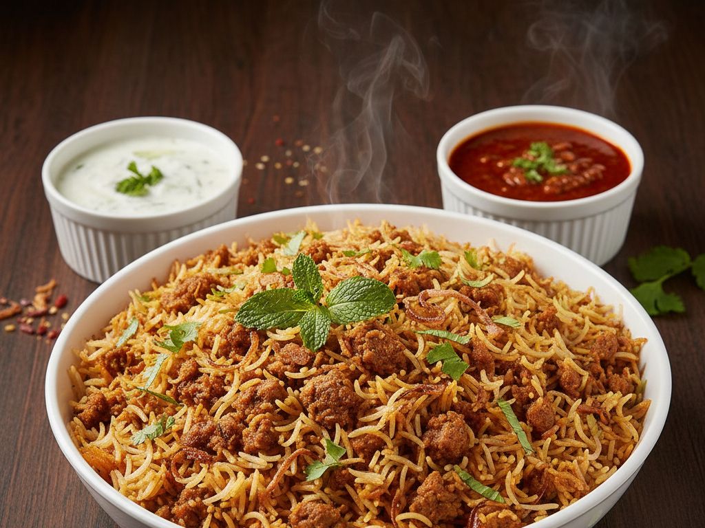 Hyderabad dum-style layered, saffron-flavored basmati rice cooked with ground lamb marinated in nizami spices, served with salan, and raita.