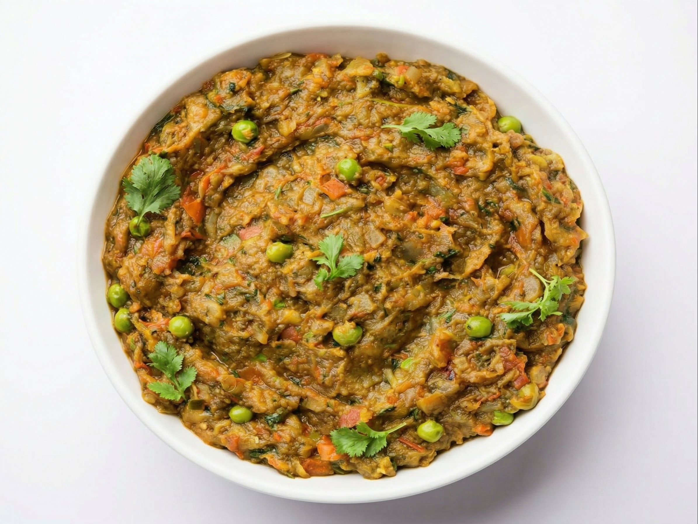 Roasted mashed eggplant braised with fresh tomatoes, peas and onions.