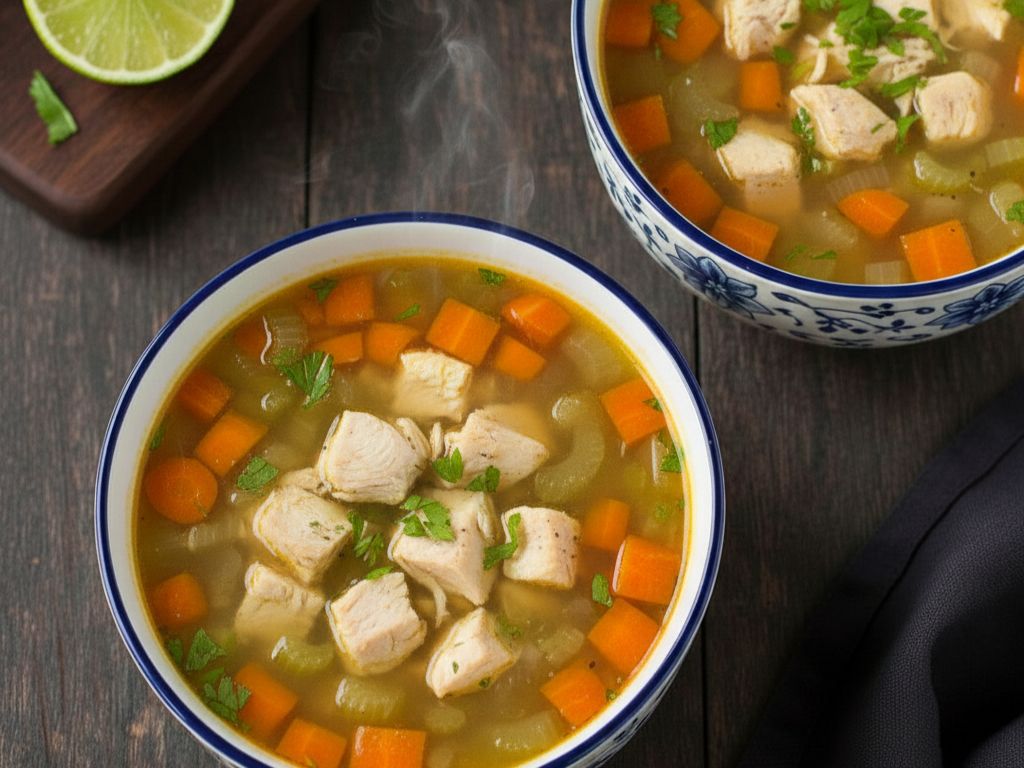 A warm and soothing soup with tender chicken pieces, seasoned with Indian spices.