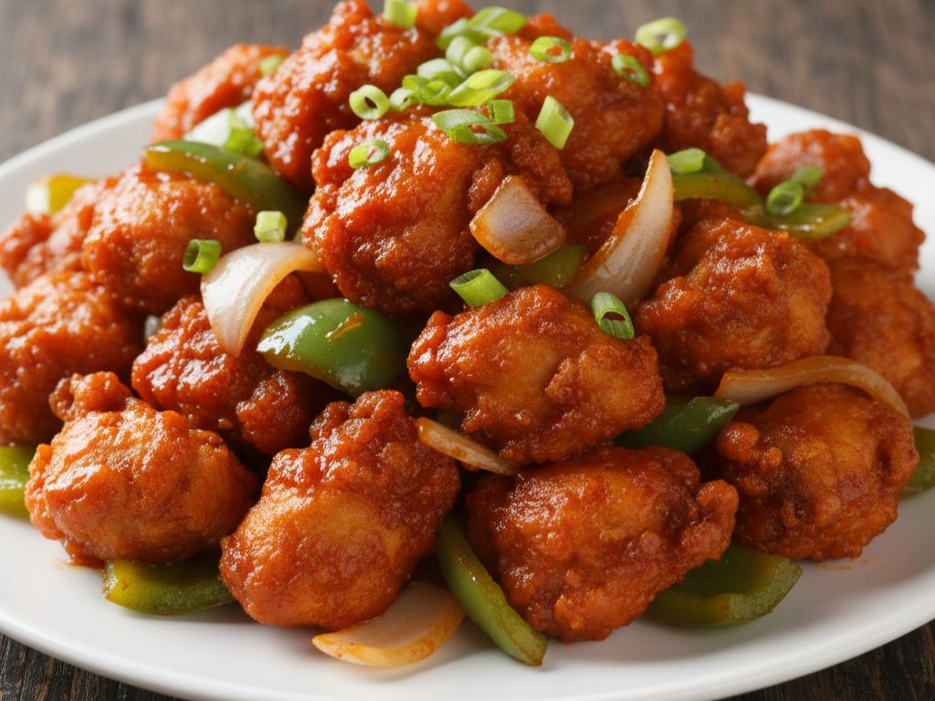 Boneless cubes of chicken marinated in cornflour batter, deep fried & tossed with chili sauce & spices.